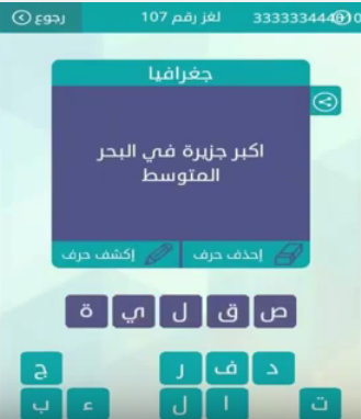 اجابة لغز اكبر جزيرة فى البحر المتوسط لغز رقم 107 من لعبة وصلة فى المجموعة الثانية عسرة صقور الإبدآع