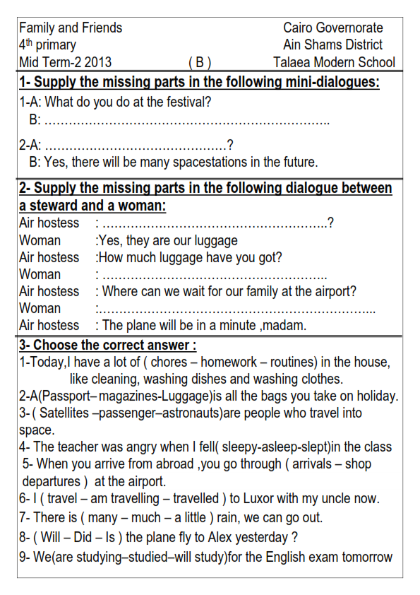 مراجعة نهائية وامتحانات لمنهج Family And Friends للرابع الابتدائى ترم اول 2016