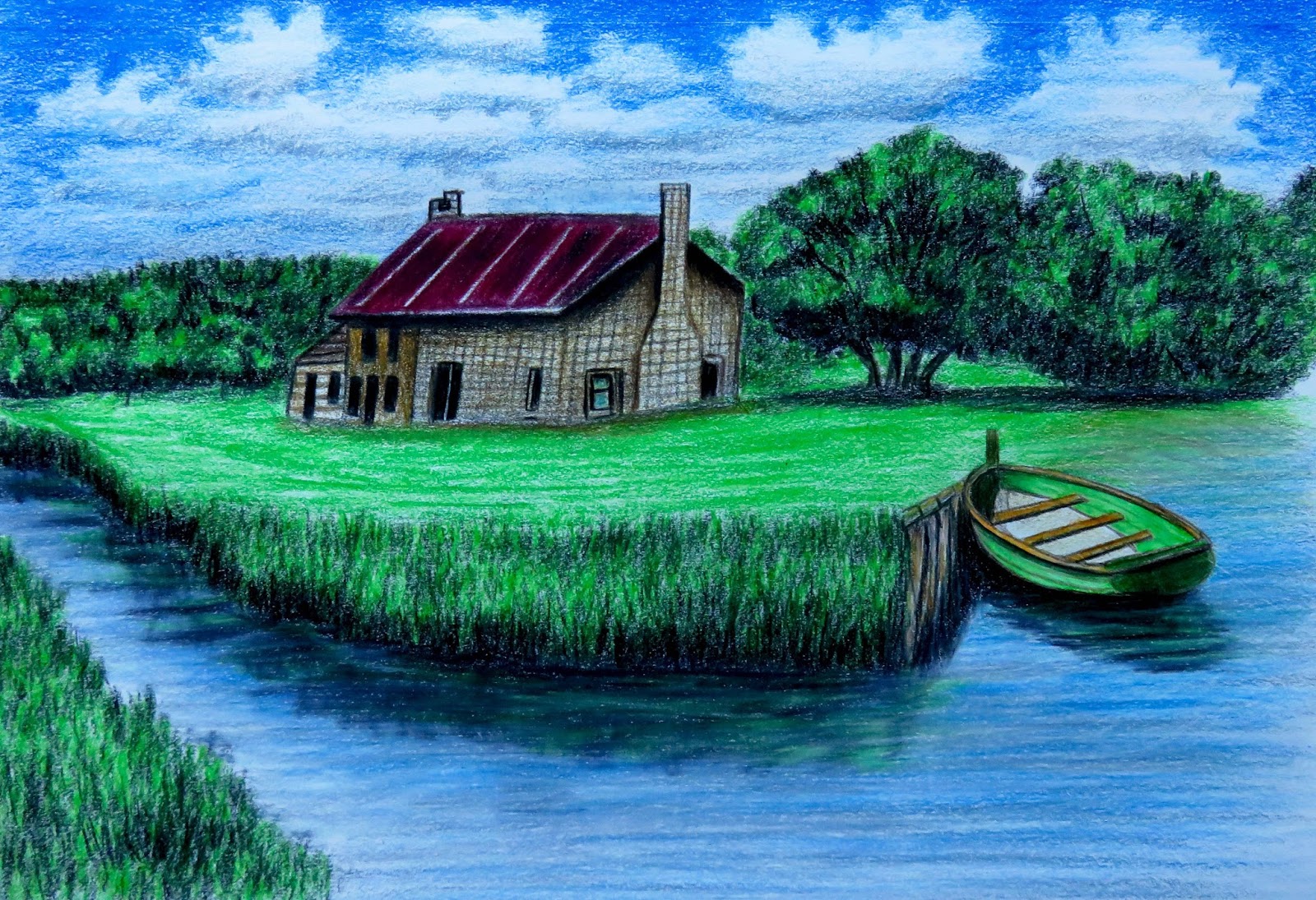 كيفية رسم منظر طبيعي بالالوان الخشبية بعد القلم الرصاص